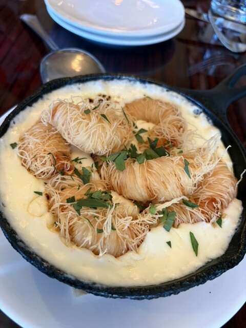 ●海老のカリカリ揚げ グラタン仕立て:カダイフに巻かれた海老が美味しい!もちろんベシャメルソースも。ワインが進む♪