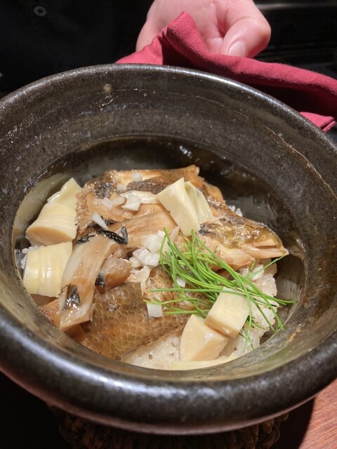 ・ヒラメのカマと筍の炊き込みご飯:締めはご飯なのが和食。生姜も効いて美味だなぁ。