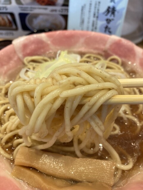 少し待ってから出て来たラーメンは、醤油の香りが良いもの。スープは醤油ベースでも少し甘味を感じる。麺の上にはメンマとネギが。麺は全粒粉を使用。つるつるとした喉越しが心地良い。スープに浸かった部分は茶色になっている、ピンク色の極薄チャーシューと一緒に麺をいただく。スープ、麺、チャーシューが一体となり、愉悦である。薄切り効果って凄いんだな。