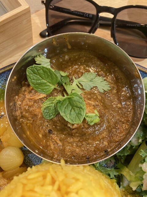 出て来た大皿は見た目も麗しい豪華版だ。全体的に茶色や黄色が支配的ではあるものの、ピンクペッパーとさつまいもビーツのピンク、パクチーやレタスの緑がアクセントになっていて、食べる前の期待感が上がった。3種のカレーはレバノン風キーマカレー、発酵サグチキンカレー、シルクロードポークビンダルー。キーマカレーはこのお店の定番らしい。小皿に入っているポークビンダルーから食べたら、はっとさせられた。果物の酸味がアクセント!お肉ごろごろのサグチキンカレー、香辛料が立つキーマカレー、どれも香りも味わいも素敵だ。どれも大変美味しく、ご飯を大盛りにすれば良かった。