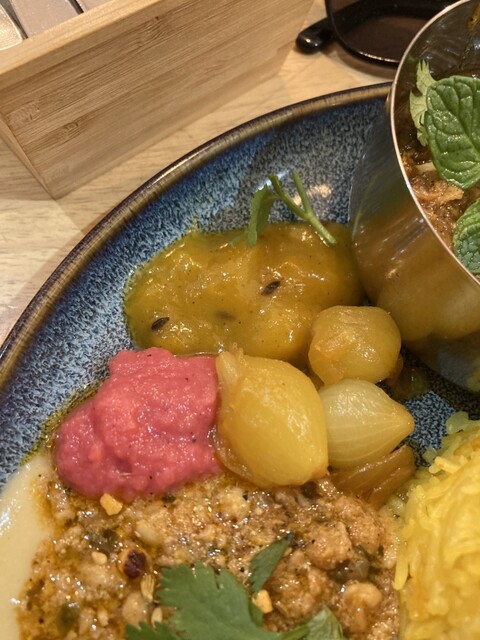 カレーの横にはマンゴーチャツネ、小玉葱ピクルス、燻製卵、ピンクが目を惹くさつまいもビーツが佇み、ライスの上にはプリザーブドレモンがいた。それぞれ、引き立て役なのに独立して美味しい。