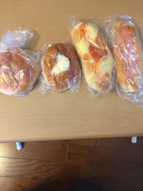 ガラスケースには数種類のパンがあり迷いますね。結局、タクアンパン、高菜パン、UFOミルクパン、ハムチーズパン他を購入。