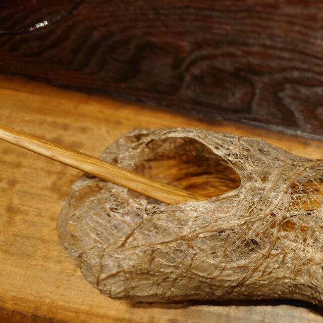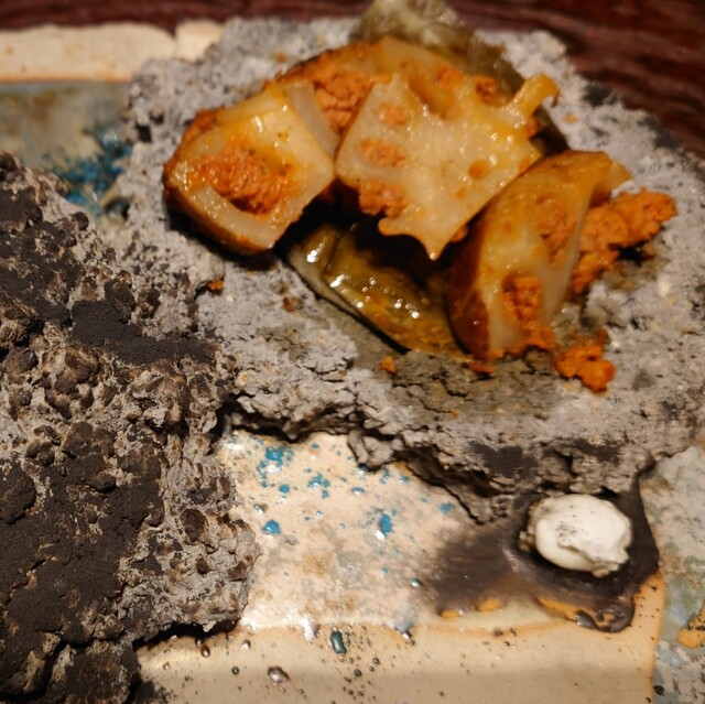 料理のコンセプトは、海面下マイナスの低さから、富士山超えのアンデスの山々の高さまでを、9段階に分けて、登ったり降りたりする空気感がイメージされている。無造作に置かれたペーパーが、高低差のイメージを感じさせる仕掛けである事に気付く。