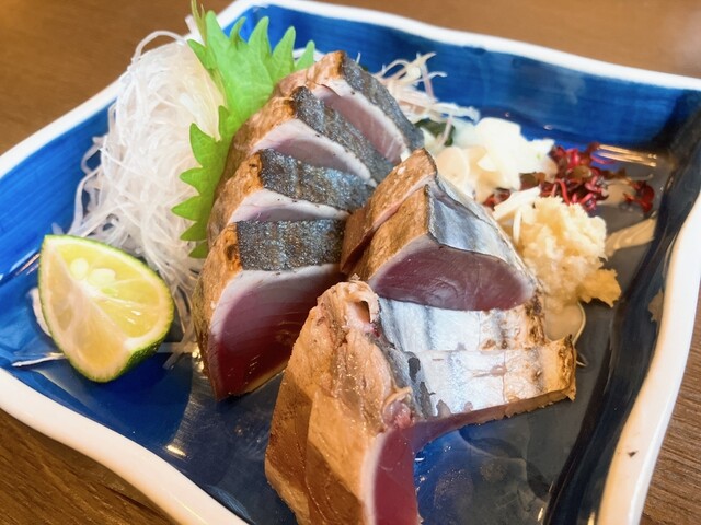 やっぱりこういう和食店に来たら造り盛りやんね♫内容は鰹・ケンイカ・きずし・貝柱炙り・鯛・たこでした。