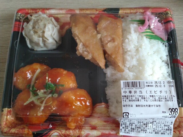 昼時にたまたま見つけたスーパーの弁当。エビチリをメインに、大き目のシュウマイと具だくさんの春巻が入っており、ボリュームもある弁当。作りたてでまだ温かい状態だったが、レンジでアツアツになるほど温めて食べたら本当に美味かった。今どき、このボリュームでこの価格は嬉しいです。美味しく頂きました。また、こちらの店舗では無料でレジ袋を提供してくださいました。有り難いです。