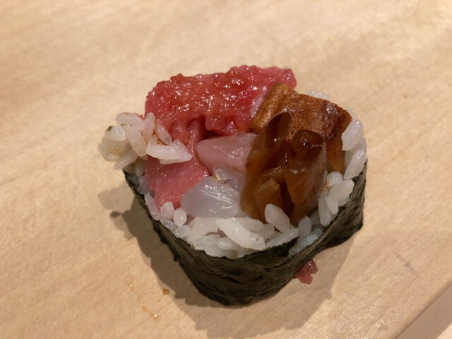 太巻きの端(大トロ、鮪叩き、干瓢、玉子、白身魚)