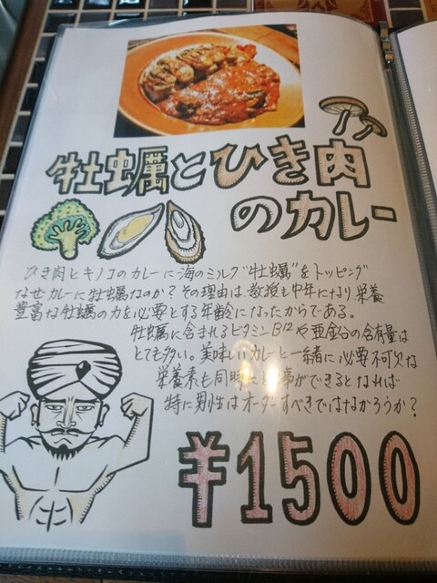 今回は『牡蠣とひき肉のカレー』(1500円)を辛さ4(辛口)、ライス高で注文。『ひき肉とキノコのカレー』(1100円)に牡蠣をプラス。