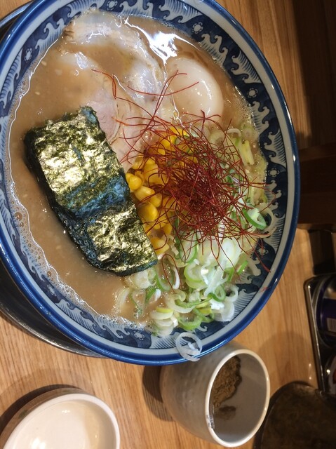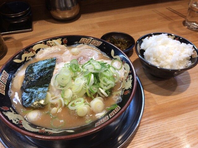 最近オープンしたから気になって行ってきたわー。オープンしたてやからかお店めっちゃくちゃ綺麗やわ。かなり豚骨やってるから、少し床はチュルチュルやけど。とんこつラーメン、煮卵、ライス小950円いったった。麺の硬さ普通、ネギ多めで頼んだわ。スープ濃い濃い。無鉄砲とよう似てるわ。美味い。ガツンとした豚骨と程よい醤油のかえし。無鉄砲との違いは、油分やろか。無鉄砲は食ってる最中でしんどなってくるが、こちらではそれがあらへん。それは背脂の量のせいなんかな。麺は中太のちじれたやつで濃いスープによう合うわ。具は食べやすいアッサリめのチャーシューとメンマ。ライス小は量が多すぎてキツかったわ。ラーメン食べてる終盤でニンニク醤油で味変してみたけど、これはしないほうが良かったかな。元々の美味い豚骨の味を壊してしまったから。総じて美味かったけど、もたれて晩御飯の時間でも全く腹減らんかったわ。他のラーメンも試したいし、また行きたいわー。