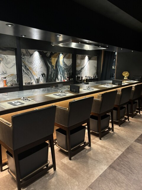 黒を基調とした高級感のある空間で、カウンター・テーブル席・個室と用途に合わせて選べます。