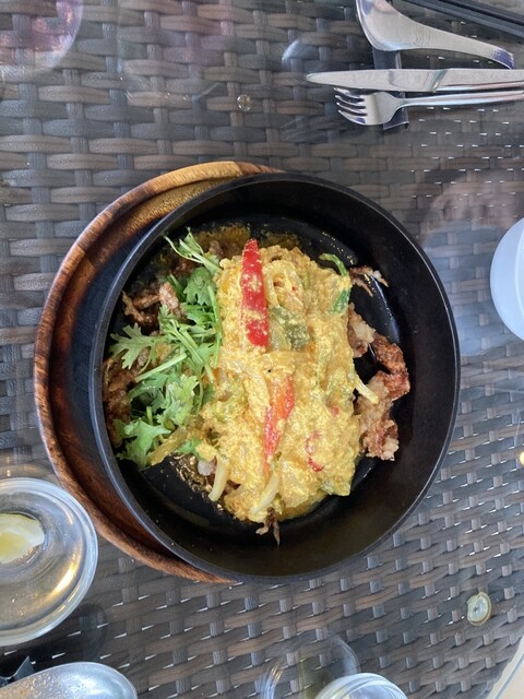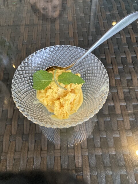 今回は、名物のソフトシェルクラブのカレー卵炒めが食べたかったので、一番上のコースを選択。まず前菜の鴨の燻製生春巻き、エビのトースト、蒸し鶏、どれも美味しく4種のソースをつけて頂くと味に深み出てこれまた美味しい。特にエビのすり身をパンに載せて焼いたトーストにマヨネーズソースをつけて食べたものが抜群だった。続いて、鯛の燻製カルパッチョ、ドーム型の器を被せてありその中は燻製の煙が充満、開けると香ばしい燻製香、そこにオリーブオイル、ニョクマムソース、大量のパクチーをかけて頂く。活け〆の鯛の鮮度が素晴らしく無茶苦茶美味しかった。次に鯛のあらと有頭エビのトムヤムクン、鯛のあらを使った出汁のため無茶苦茶コクがあり、日本で頂くトムヤムクンの中では最高の部類だと思う。そしていよいよソフトシェルクラブのカレー卵炒め、演出も素晴らしく、揚げたてのソフトシェルクラブの上からカレー卵炒めソースを一気にかけて、ぱちぱちと音を楽しむ演出。早速頂くと、ソフトシェルクラブの甘さと香ばしさに卵のふわふわな食感、さらには優しいカレーの風味、これらが渾然一体となって口の中に広がる、幸せのひとこと。次のお肉は、豚トロと鶏もも肉の炙り焼き、すなわちチャーシューみたいなものだが、パクチーとソースをかけて頂くと、鶏は皮がパリパリで香ばしく、豚トロはしっとり柔らかく、どちらも楽しめた。ご飯は、ガパオライス、グリーンカレー、パッタイ、トムヤムクンラーメンから選べ、その量まで選べる。私はここの名物のトムヤムクンラーメンをハーフで注文、先程のトムヤムクンとはまた違って、ココナッツミルクが効いた柔らかくあっさりとした味わい、これは麺の入ったスープとしては、スープ単独で頂くスープとはまた違う味わいで、大変良かった。そして最後に、全く期待していなかったんだが、デザートのマンゴーバニラアイス、この演出もまた素晴らしく、テーブルに石臼に入ったマンゴージュースとバニラ❤️の液体を持ってきて、そこに液体窒素を一気に流し込み、かき混ぜるという演出、取り分けてもらったアイスを一口食べると、これまで味わったことのない天にも上るような美味しさ、この味は何とも表現できないが、まろやかで口当たりが良く、マンゴーの味がしっかりと効きつつ、バニラビーンズの種をしっかり入れた滑らかなアイスクリームの渾然一体としたエモ言われぬ美味しさ、こんなアイスはこれまででダントツの一番でした。これは経験しないと分かり得ない味わいでした。