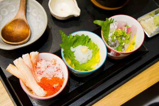 店内で食事をする場合は、新鮮な海鮮丼が楽しめます。氷見漁港で食べるブリ丼のように、こちらでも小さな鍋味噌汁がついてきます。その中にはたっぷりと魚の具材が入っていて、ゆっくり温めて飲むことができます。寒い天気でも温かく食べられるので最高です。