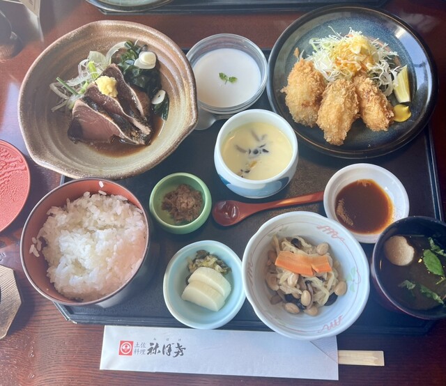 週替わり定食1,500円は今週は鰹のたたきとカキフライでした。茶碗蒸しや小鉢がいくつか付いてデザートの杏仁ゼリー?も付きます。