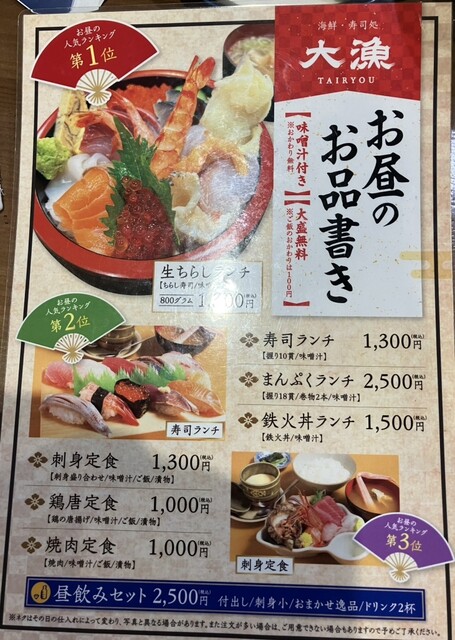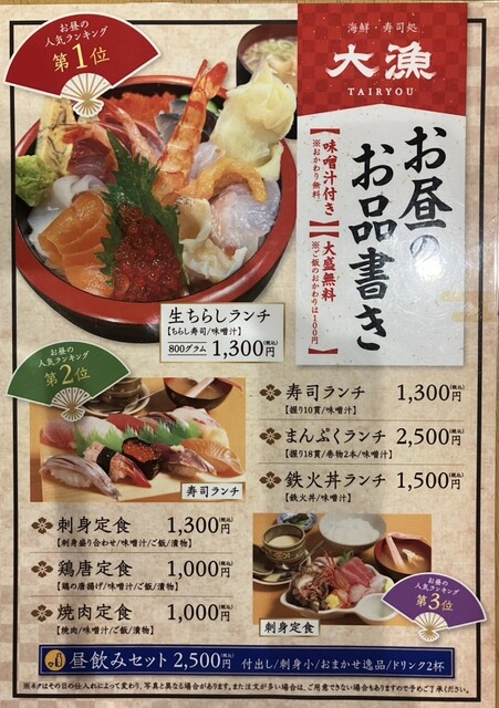 海鮮丼の姫盛り1,500円にしようと思いましたが、初めて寿司ランチを頼んでみました。