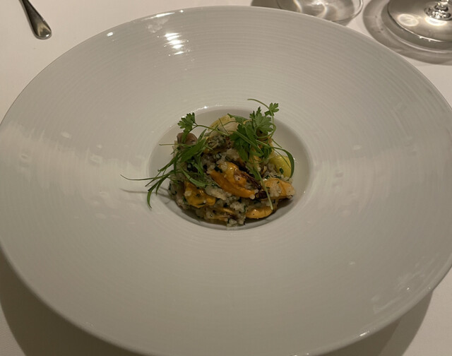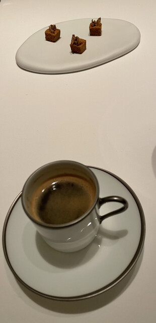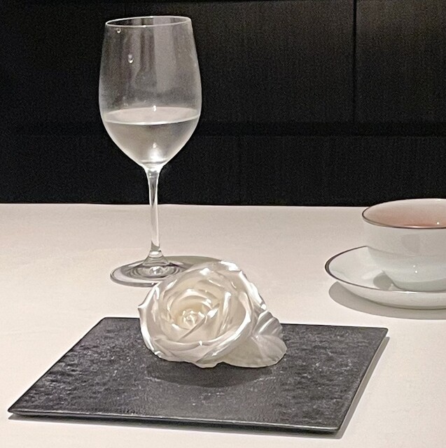 娘の誕生日祝いほか諸々のお祝いを兼ねて個室にて。手の込んだお料理の数々、総勢18品。ワイン6種のペアリング。それはそれは美味しゅうござました!栗のスープ、穴熊のラグーなどの前菜が4品。メインお魚は鯛(レア気味な身と皮のパリ目が最高)、お肉は鳩(濃厚なソースがナイス)、そしてデザート4品はメレンゲのアイス(能登塩添え)など。そしてお誕生日お祝いの白い薔薇(飴細工)は芸術‼️さすがのグランメゾン東京(^^)