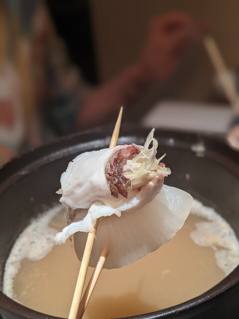 鯛白湯と鶏白湯の半々の出汁で作られたお鍋のスープだそうで、聞いただけでヨダレが出ます。串に刺された具材をしゃぶしゃぶするスタイルなので、お鍋は人と食べるには何気に面倒くさいなと思われてる方でも安心・楽ちんです(笑)
