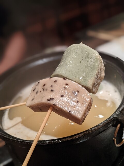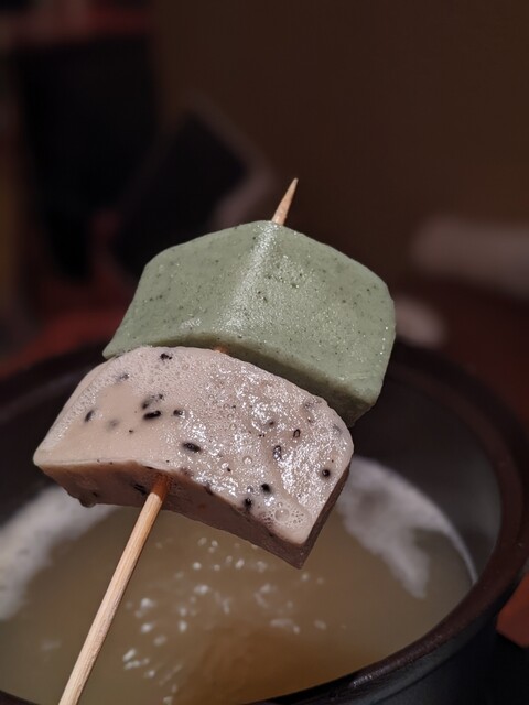 出汁を吸った串しゃぶたちは、薬味との相性も良くて美味しい〜♫カマンベールチーズは湯葉で包まれていて、しゃぶしゃぶで溶けても大丈夫なナイスアイデア!(さすがにとろけ過ぎると救出作戦に出ないといけないですが(笑))