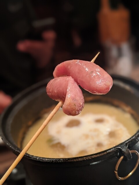 そして、お魚のアヒージョまで出てくるなんて!これは女子は喜びます。この日のお魚はブリかな。美味しい〜。オリーブオイルに前菜の野菜を付けたり、串しゃぶの薬味として使ったりもできる♫かぶらやトマトベーコンとか付けて食べると洋風になって美味しかった。