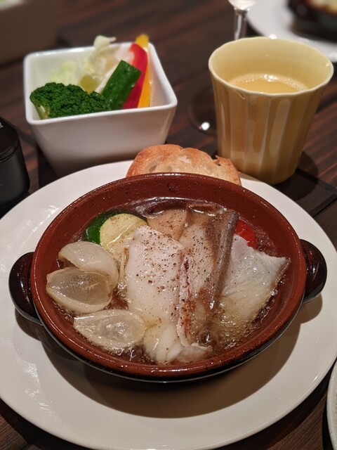 前菜(野菜、鶏スープ、アヒージョ&バケット)