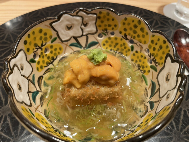 揚げ胡麻豆腐…うるい餡、雲丹添えて
