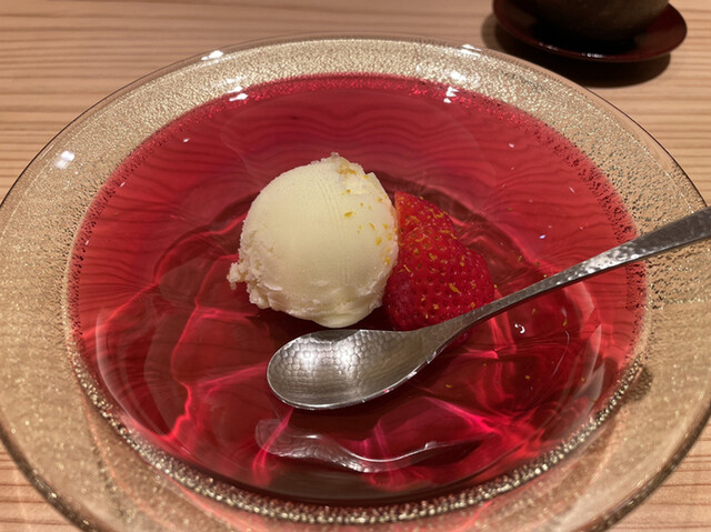 デザートには、柚子シャーベットと苺を頂き、お腹いっぱいご馳走さまでした