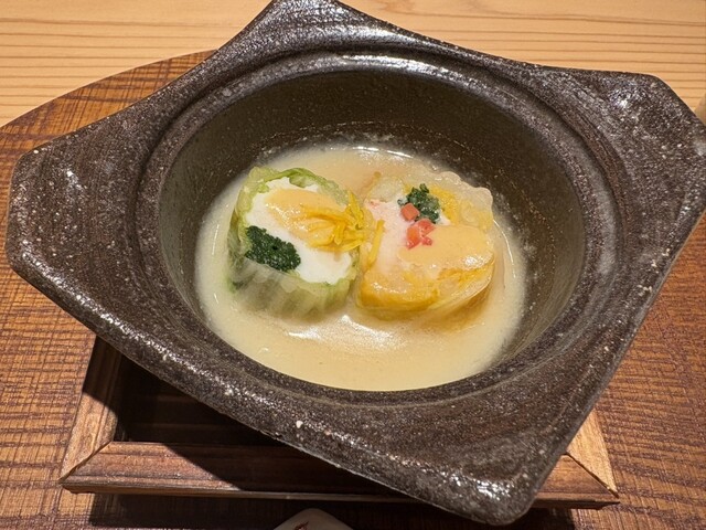 蓬餅の揚げ出し、河豚アン、とうとおみ、白子入り