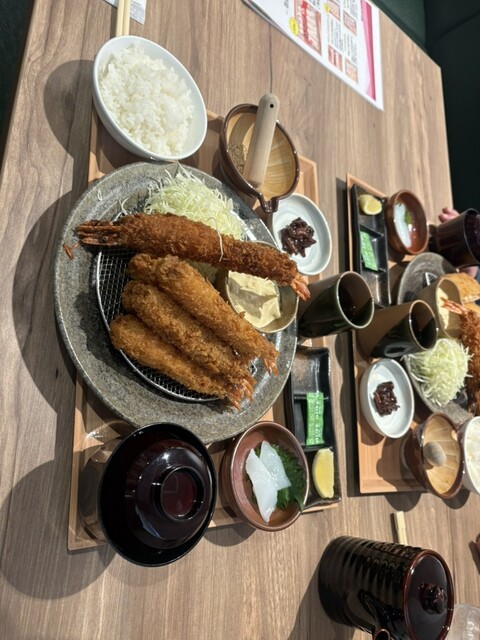 せっかく遠出したので衣が薄いマウンテンエビフライ定食6本 1650円とエビカツ定食4切1650円を注文。2人だったので1人当たりエビカツ2枚と衣が薄いエビフライ3本 ずつシェアしたら豪華な定食が2つ出来上がり。さらにそれぞれ有頭エビ1本550円ずつ追加。2人で4400円と贅沢でしたが凄く豪華な定食が2丁出来上がり。