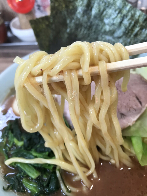 その少しザラザラドロドロとしたスープが家系特有の麺より若干細い中細麺にまとわり付き絡み時間が経つとまるで麺にスープの味を付けた様に麺が茶褐色に染まり…麺とスープの混合一体となりうまい!