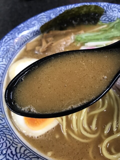 味玉の甘辛い味付けも良い。黄身は若干半熟でプルンとし黄身まで味。うまい!