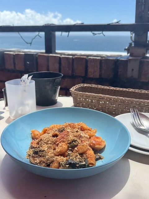 とにかくロケーションが素晴らしく、見渡す限りの海に江ノ島がのぞめます。青空に入道雲、赤いパラソルが映え、それだけで1時間半かけて行く甲斐があるというもの。
