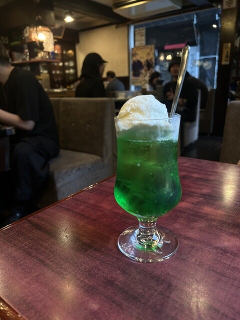 ここのはメロンソーダにアイスという安直な感じではなく、シロップ系のやつの甘いタイプのやつで嬉しいやつ