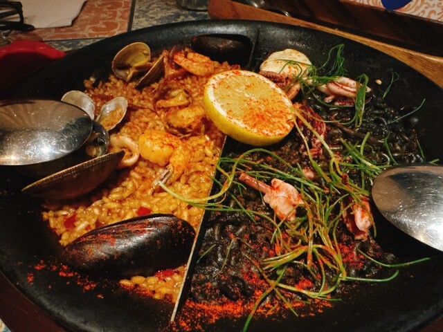 ピンチョスを4種類、おすすめのタコのガリシア風、白子のフニャなんとか春菊添え、パエリア、デザートをいただきました。