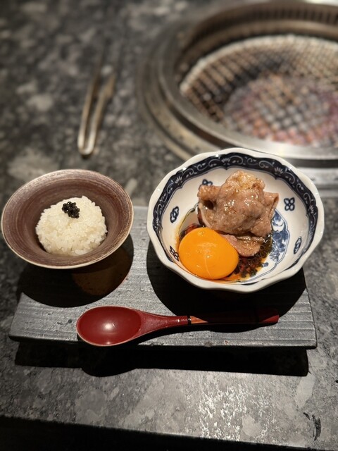 スタッフさんが丁寧に焼き上げてくれ、卵黄にくぐらせてからひと口サイズのごはんと合わせると…最高の“すき焼き風焼肉”。とろける脂と卵黄のまろやかさが一気に幸福度を高める。