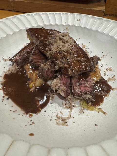 松阪ポーク肩ロースは牡蠣のバターソースがかかったものかと思ったら、牡蠣そのものがゴロゴロ入ったバターソースではないですか。お肉も柔らかくて味も美味しくてバルサミコソースで引きたてていてスパークリングワインとバッチリでしたね。