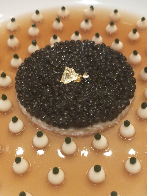 フォアグラのコポーとインカの目覚めのマリネに黒トリュフを削りかけて