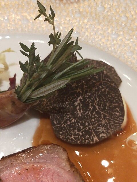 フランス産仔牛のロティ 黒トリュフ香るポテトピュレとハーブのサラダを添えて