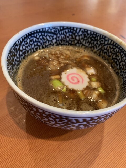 えなみさんのつけ麺、スープに薬味やチャーシューなどのをガッサリ入れてくれるところが好きです、、
