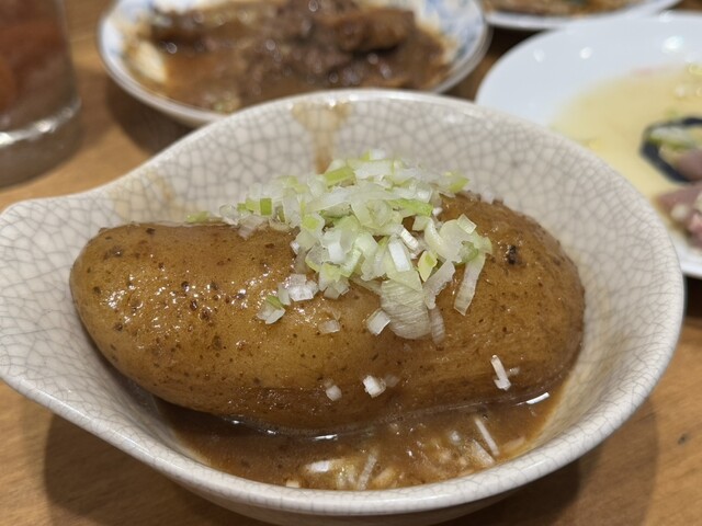 豚なんこつ煮込みは、コリッとした食感を残しつつ、とろっと柔らかい部分もあって見事。濃い旨みで焼酎ロックの手が止まらない。