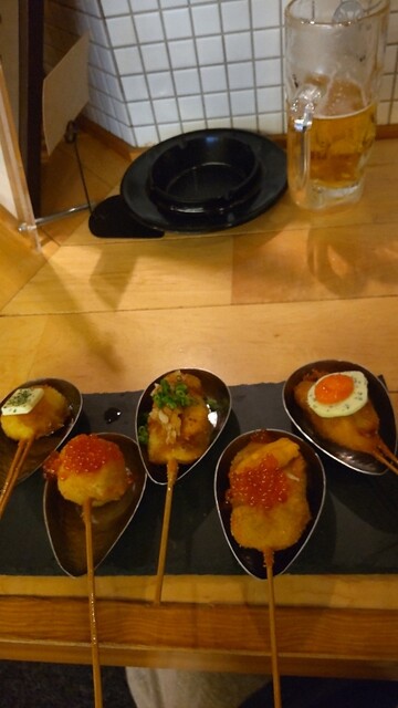 ※贅沢串揚げ盛合わせ・牡蠣の明太串+サーモン親子串+貝柱串がオキニとなりました。特にサーモンと貝柱が馬し。