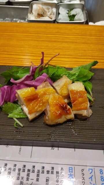 ★鶏もも肉の原始焼き・一夜干しをして低温調理で火お通し最後に炭火焼みたいたがこれがうま味の塊のもも肉だった。