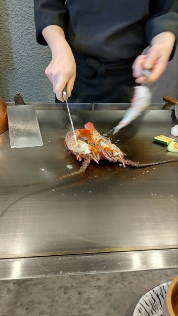 ◆活け伊勢海老の鉄板焼き・小ぶりな伊勢えびだがこれが今年初の伊勢えびだね、新鮮なうま味が味わえて最高だった。
