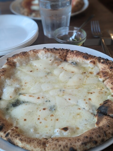 4種チーズ ブルーチーズが上品に効いている。生地との相性も素晴らしい。ハチミツにもっとクセがあっても面白いかも。優等生的クワトロ。