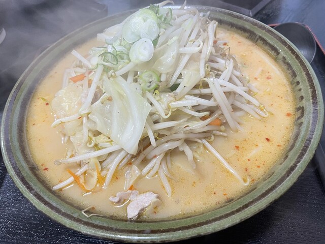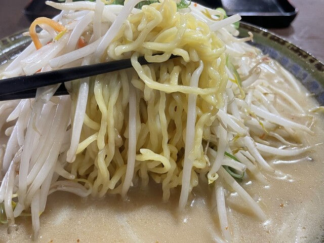 硬めで茹で加減ばっちりの中太緩縮れ麺に白濁したピリ辛スープが絡んでどんどん箸が進みます。