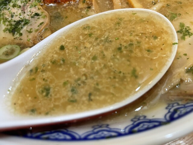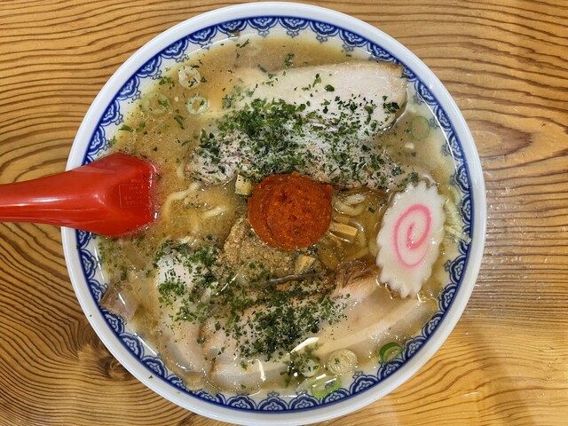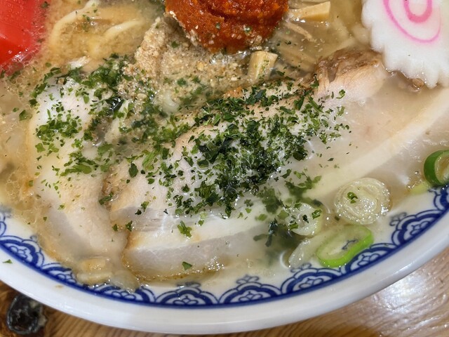 たっぷりのチャーシューも食べごたえ抜群でメンマも美味、青のりの風味がアクセントになり大満足の1杯になりました。