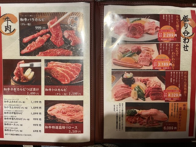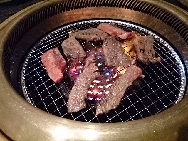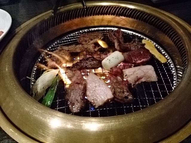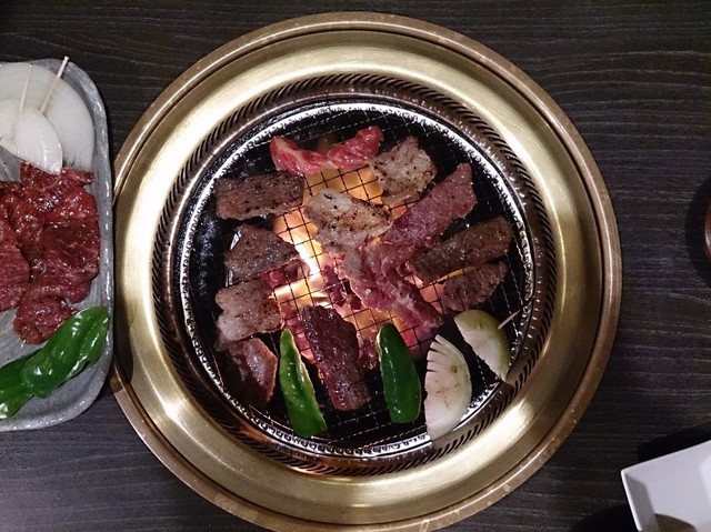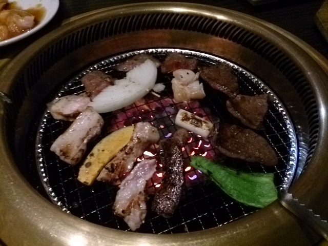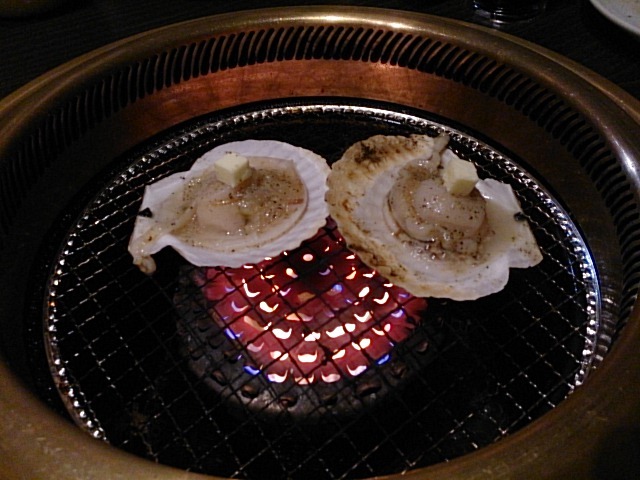 今回オーダーしたのは「だんらん家族盛り・上牛タン塩・和牛上ロース・プリプリえび焼き・殻付きほたて・いか一夜干し・ハラミ・和牛中落ちカルビ・上ミノ・白菜のキムチ・サンチュ・ライス」、どれも美味でアルコールがどんどん進みます。