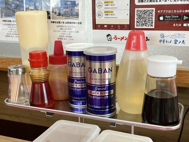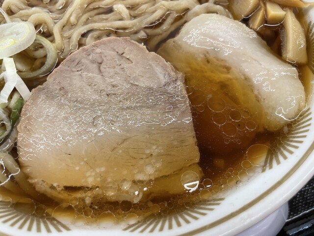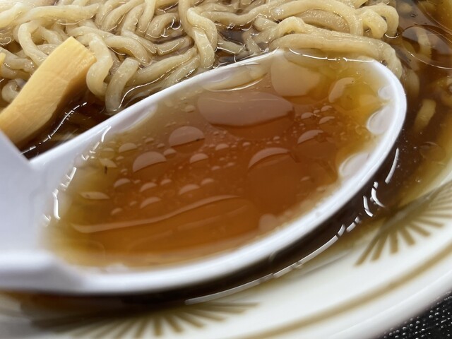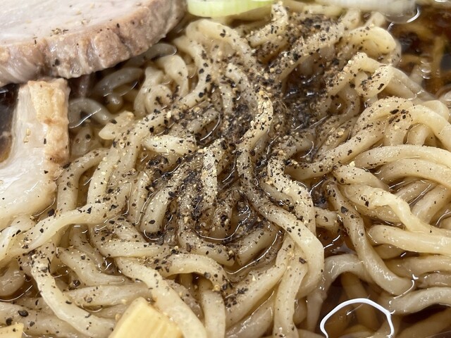 見た目も味も同系列の「雲ノ糸」さんとは一線を画したもので、トッピングはチャーシュー・メンマ・ねぎとシンプル、小麦の香りが抜群の中太縮れ麺に昔ながらの懐かしさを感じ、いつまでも飲んでいられるタイプの優しいスープが絡んで美味、途中ブラックペッパーを掛けて味変を楽しみ最高の一杯になりました。