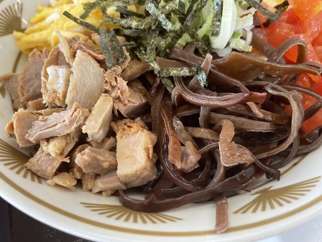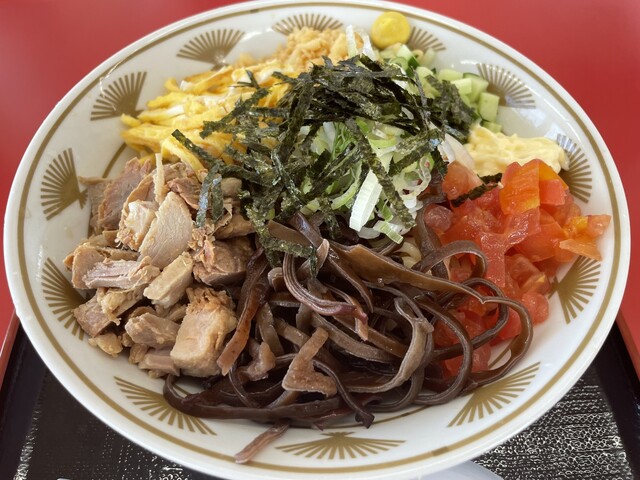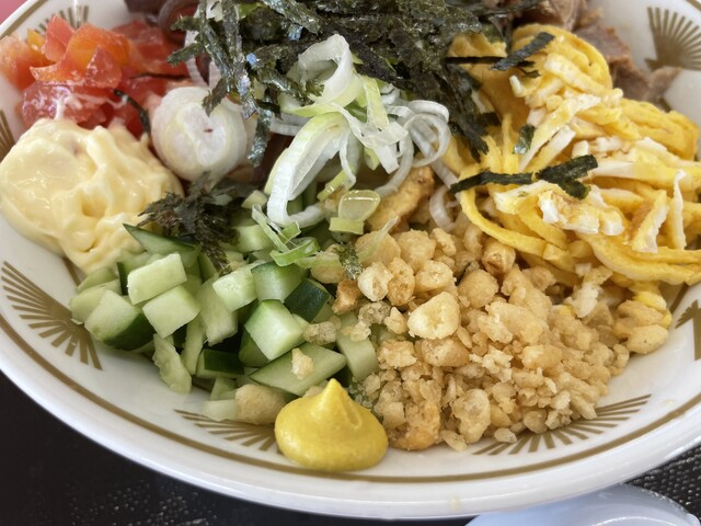 程なくして着丼、トッピングは「刻みチャーシュー・錦糸卵・天かす・角切りきゅうり・角切りトマト・細切りキクラゲ・輪切りねぎ・刻みのり・からし」と豪華版で麺が全く見えない状態になっています。