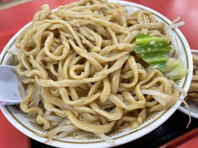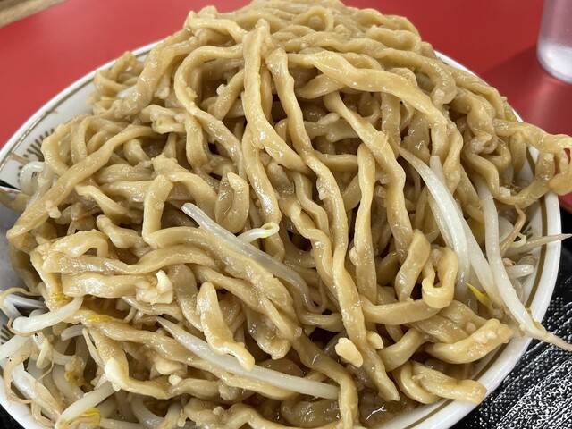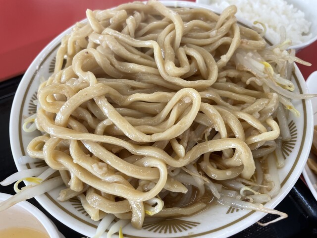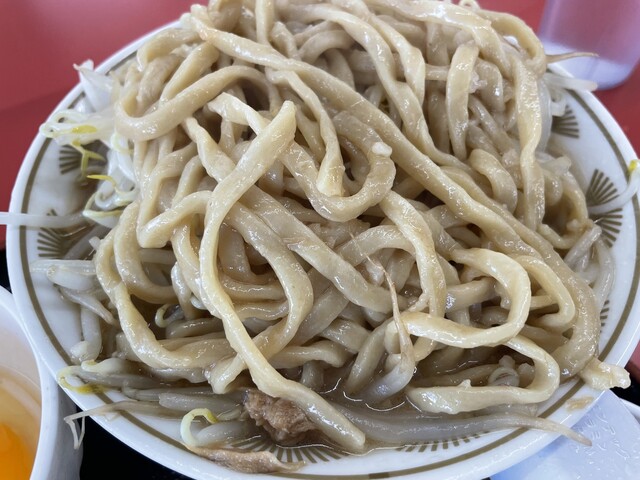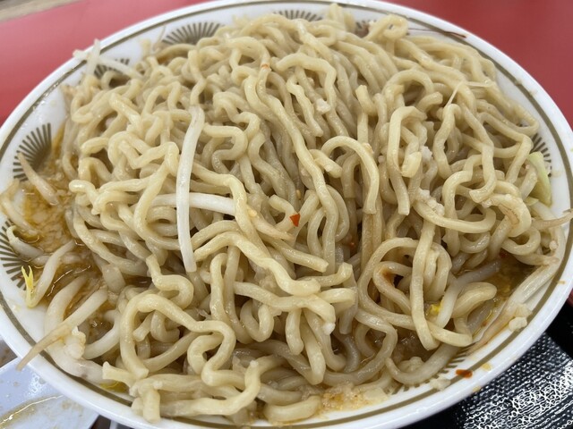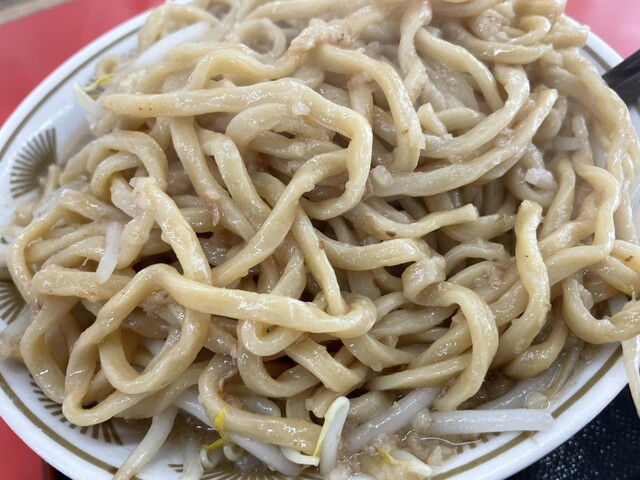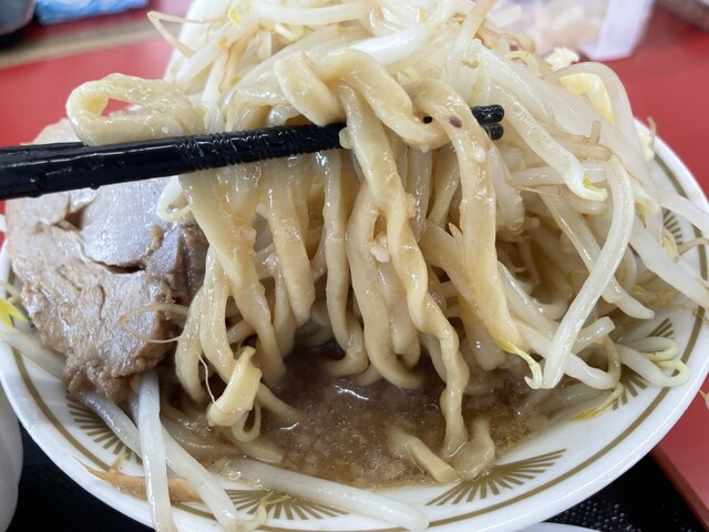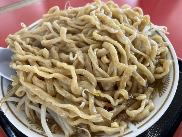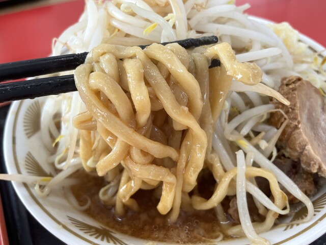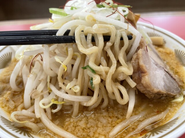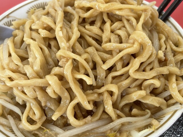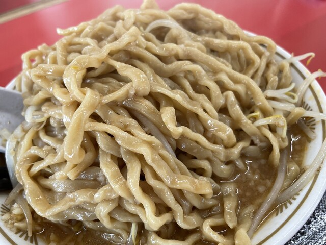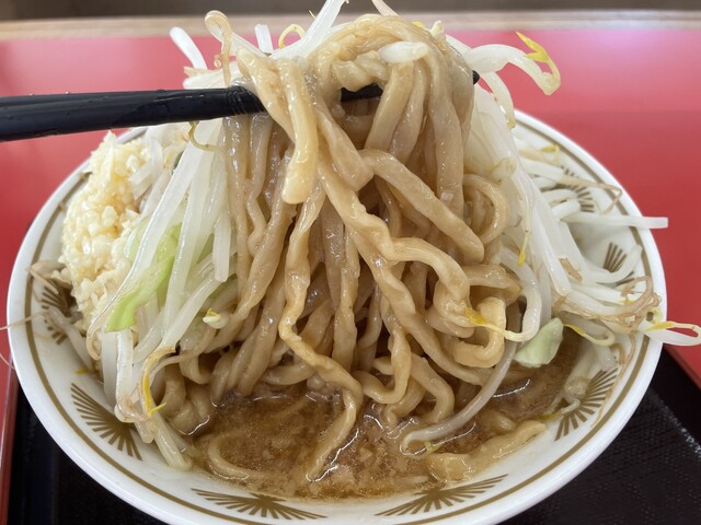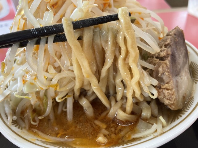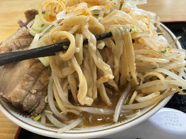 『朝食セット(ラーメンニンニク野菜マシマシ&ライス普通)+A賞特典』の麺