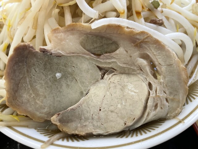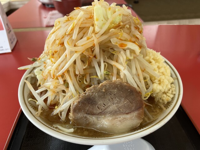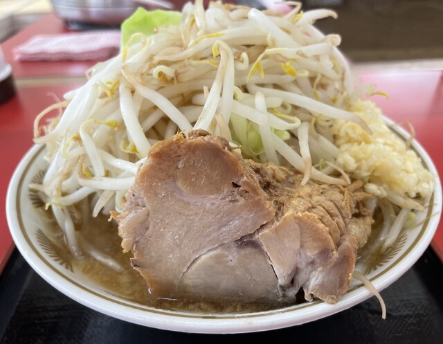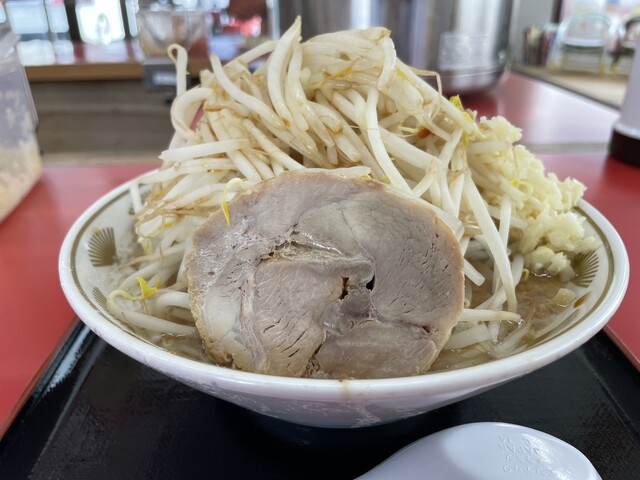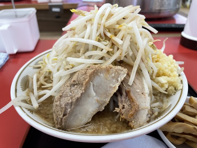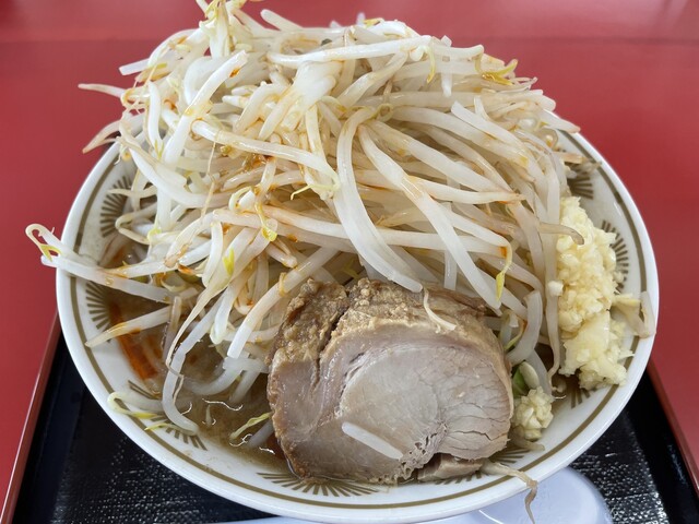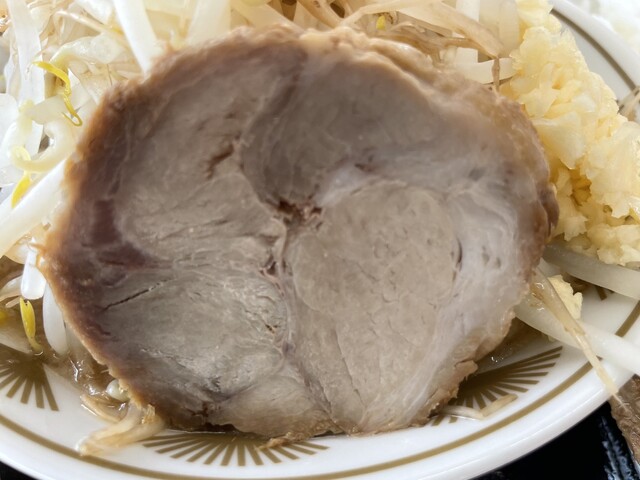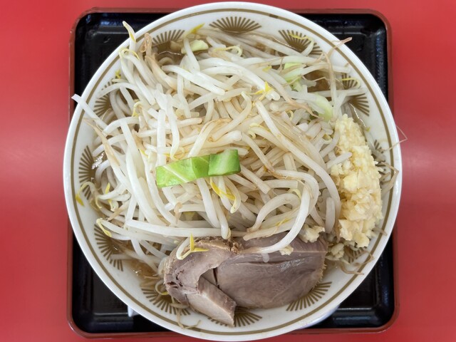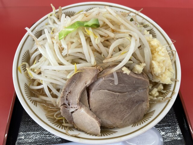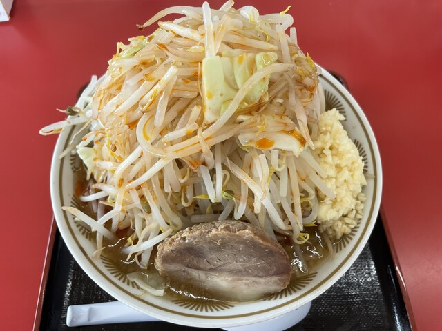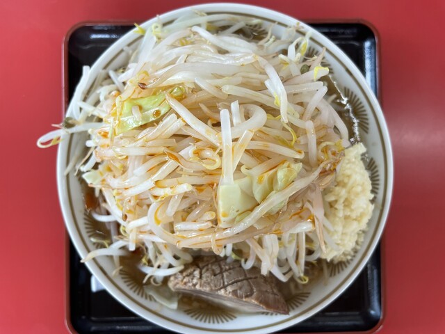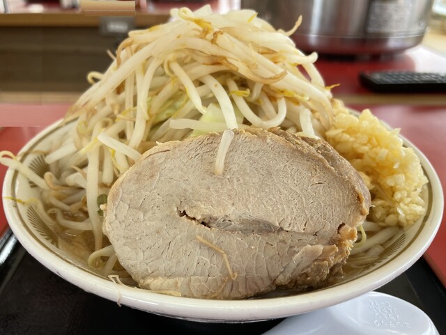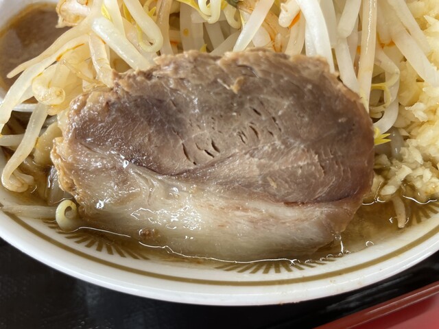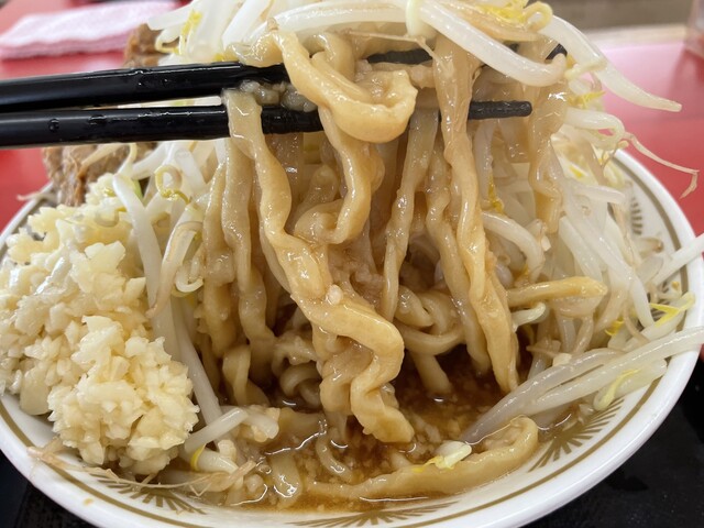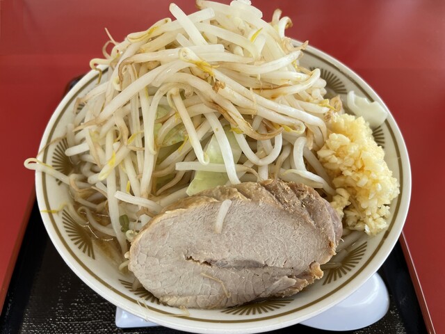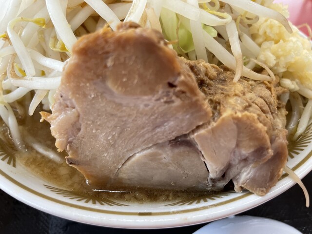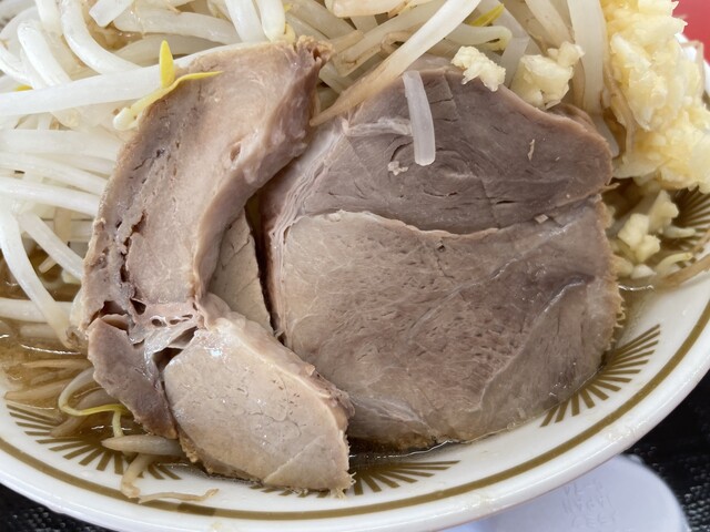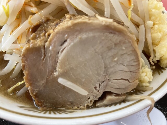 分厚い豚も食べごたえ十分、やっぱり二郎系には美味さを倍増させるニンニクが欠かせません。