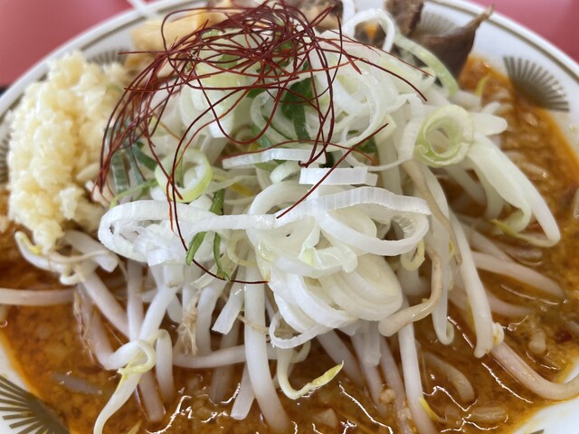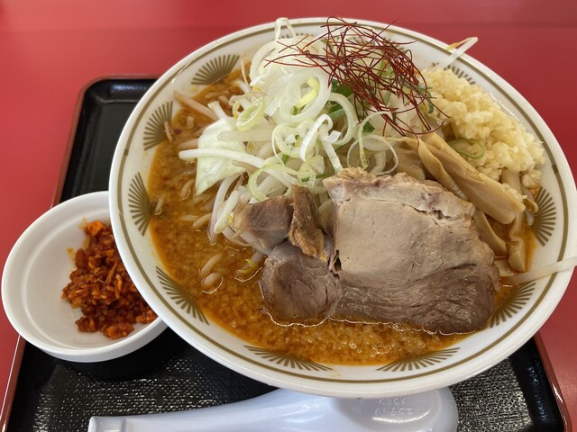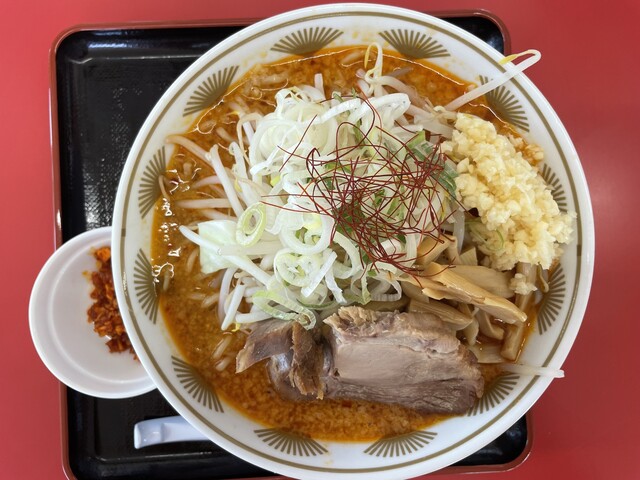 濃厚な味噌ダレとピリッとした赤唐辛子&食べるラー油の辛味の相性が抜群、ニンニクをのせることで美味しさもマシマシ、小麦のいい香りがする中太縮れ麺との相性もバッチリです。