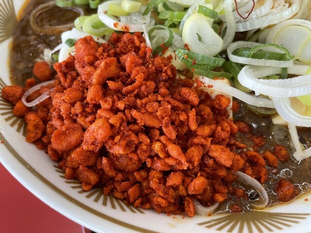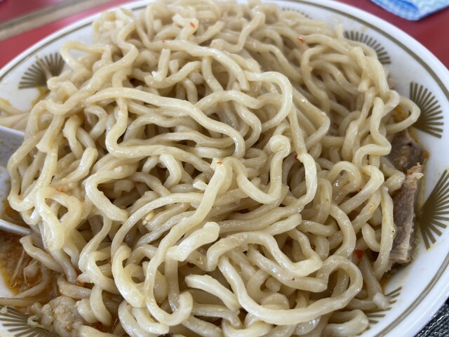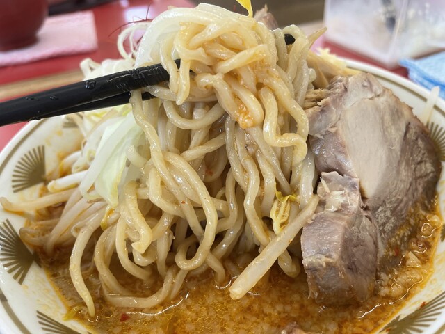 ワシワシの平太縮れ麺と分厚い豚4枚は圧巻の量ですが、程よい辛さがアクセントになって箸が止まりません。